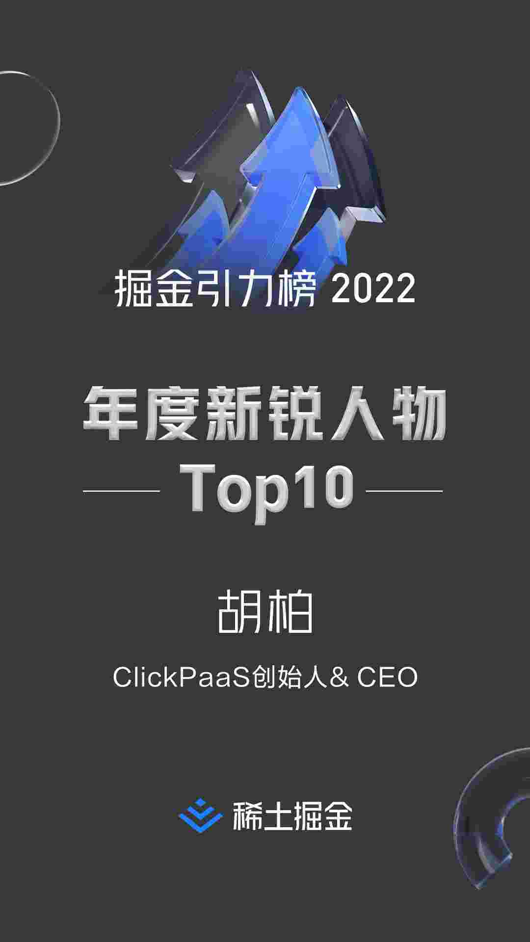 2022年1月6日,,,稀土掘金社区第一届「掘金未来大会」成功举办,,,会上发布了“2022 稀土掘金引力榜 年度新锐人物”榜单,,,,上海爱湃斯科技有限公司(简称GOPAY钱包)创始人及CEO胡柏实力入选年度新锐人物TOP 10。。